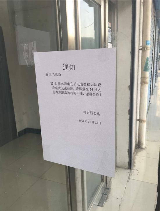 (根据通州台湖镇政府下发的通知,亦园青年创业园周边5家公寓应于11月26日全面停水停电,图为5家公寓之一的神兴园公寓的通知饶贤君/摄)
